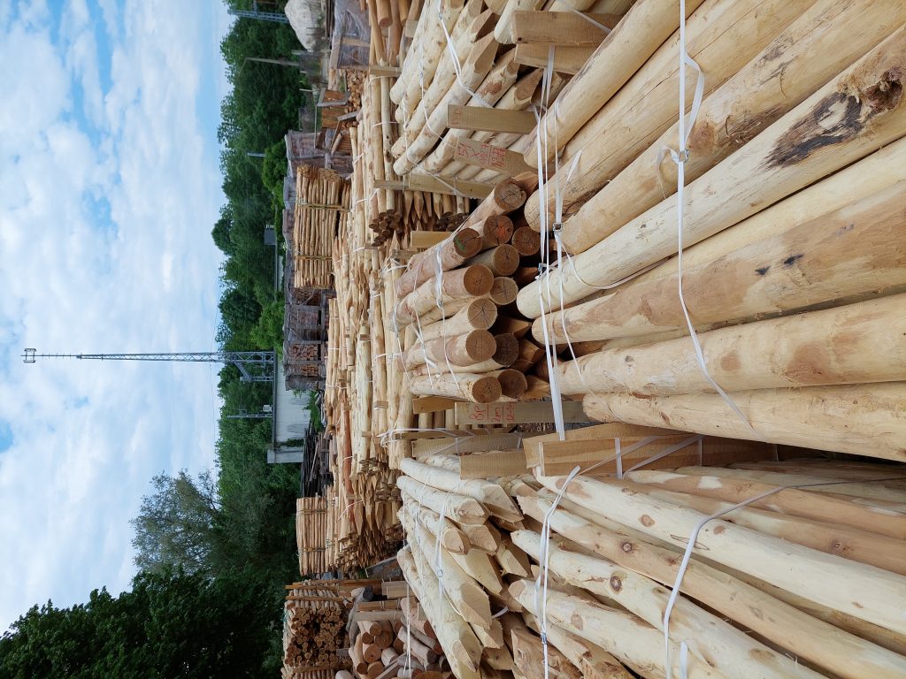 Die Krusten der Robinien-Säulen werden mechanisch entfernt, dann das dickere Ende an vier Seiten gespitzt und das schmalere Ende gekrönt. Sie Werden nach den gewünschten Abmessungen eingelagert.