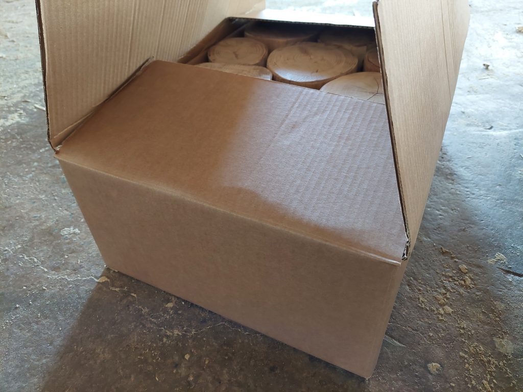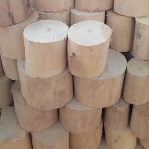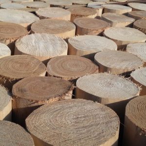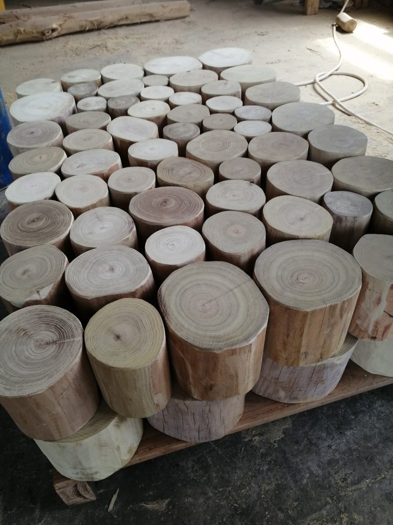 Das Splintholz unter der Kruste der Robinien-Säulen wird zusammen mit der Kruste durch Fräsen entfernt. Die abgefräste Säule wird in der gewünschten Länge zersägt. Die Enden der Scheiben werden glatt geschliffen, und die Kanten abgebrochen. Sie werden auf Paletten reihenweise verpackt.